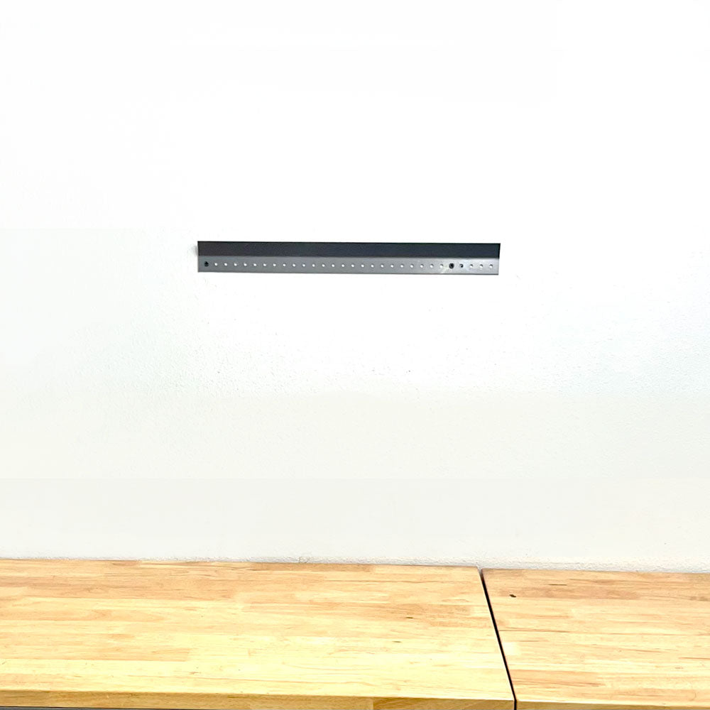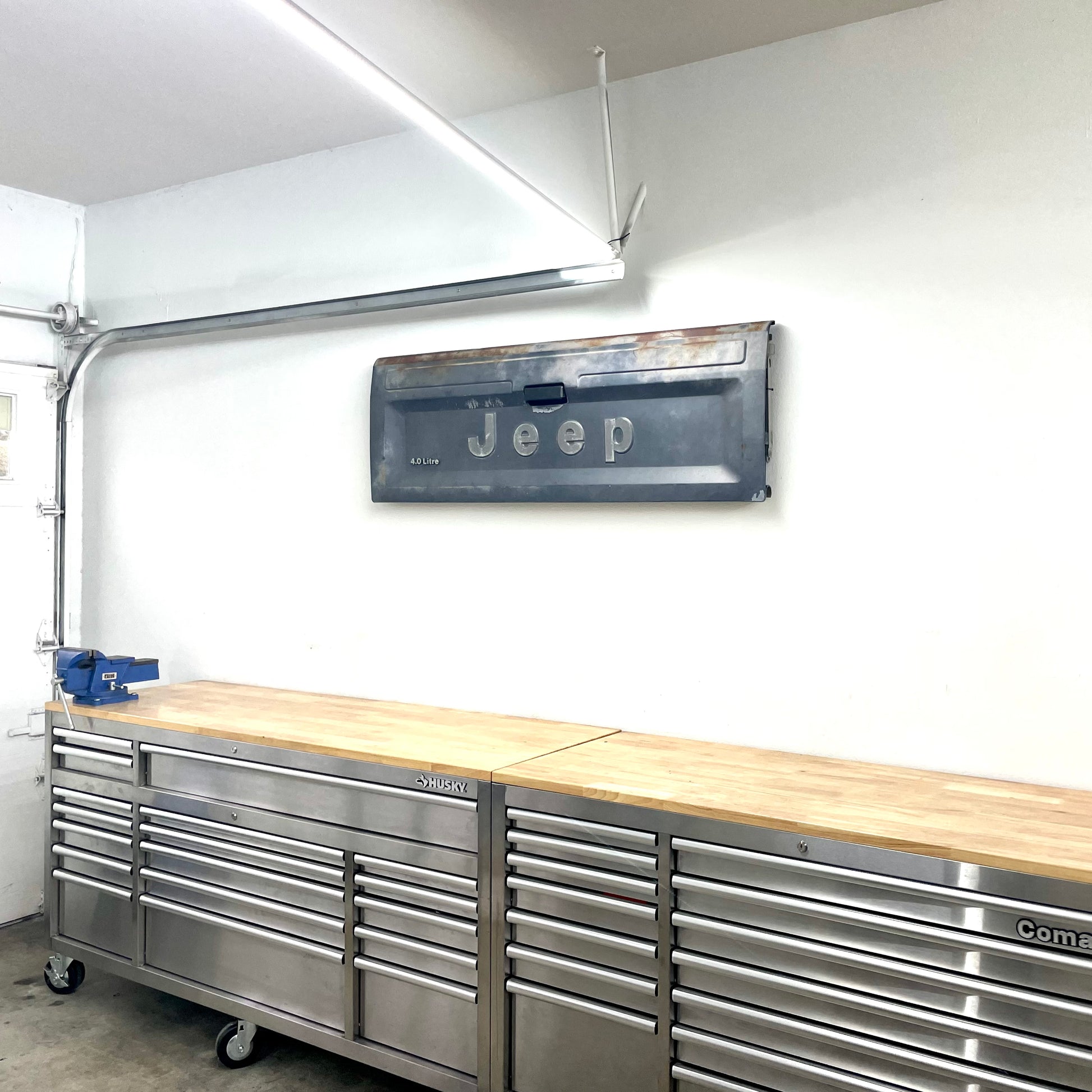 This bracket system allows you to mount a tailgate from a Jeep Comanche MJ to your wall between two standard 16" studs. This is a two-piece design that allows for easy hanging with a single person.