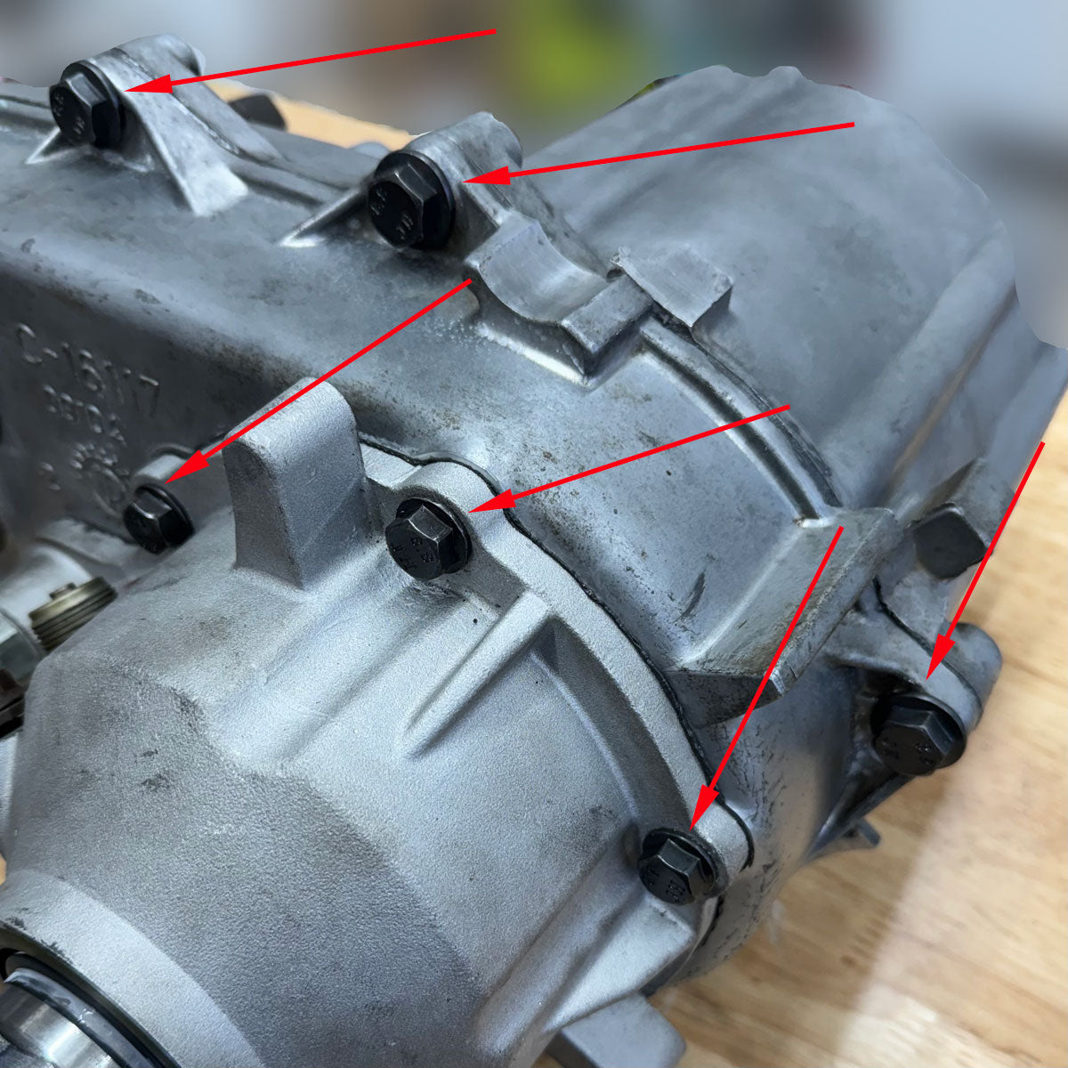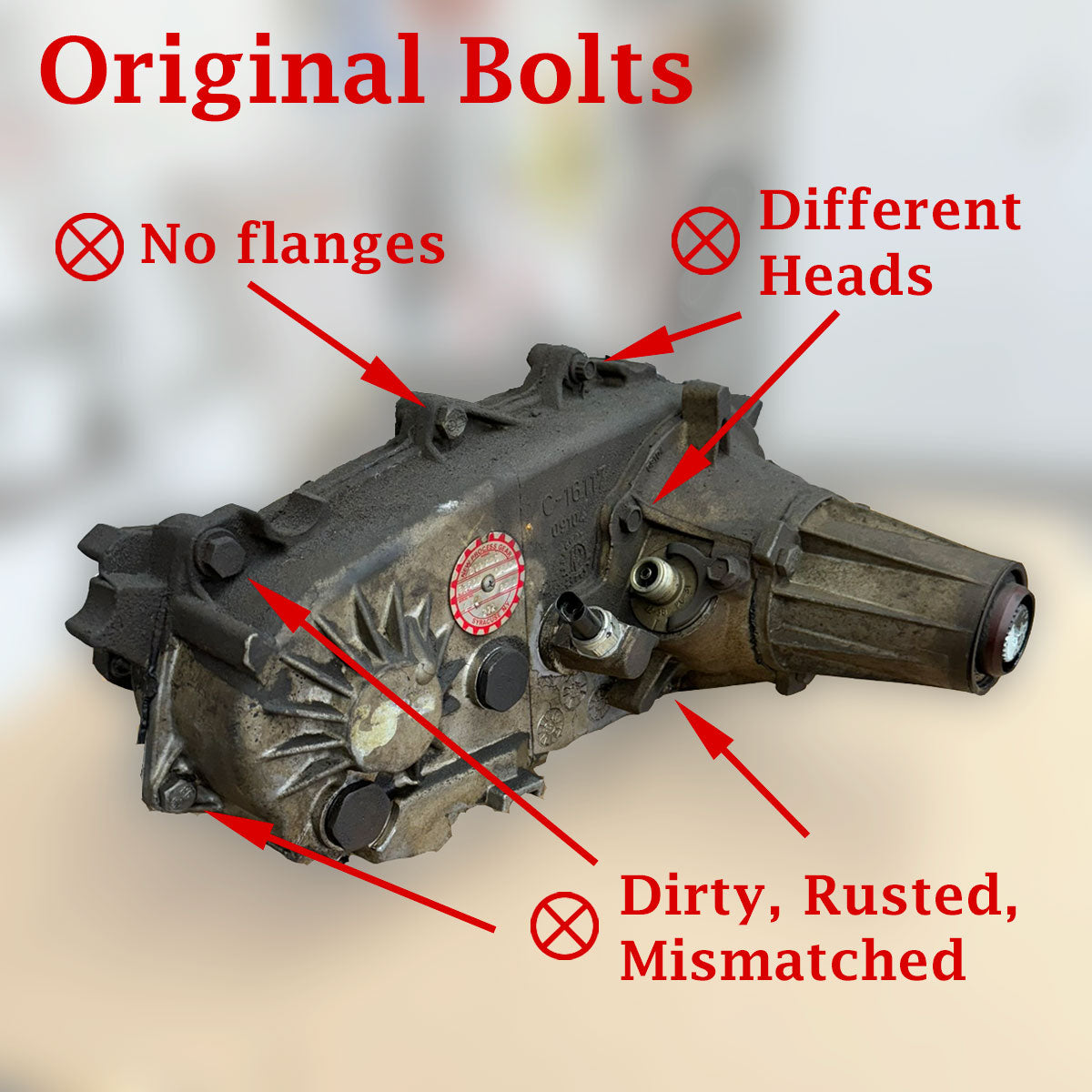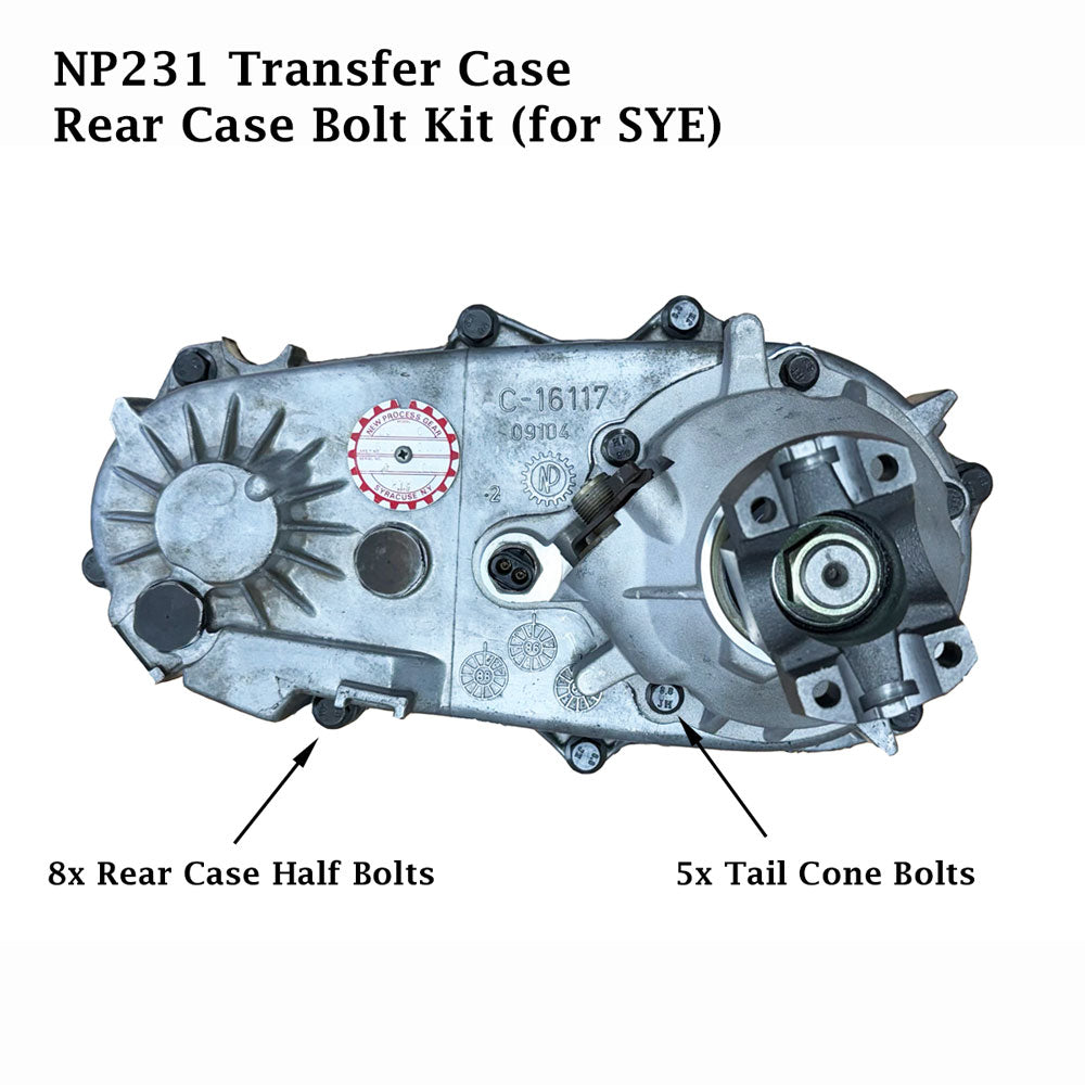 High quality Grade 8.8 hex flange bolt kit for NP231 Transfer Case - Rear Case Half. If you are planning to install an SYE, we highly recommend using this kit as the original bolts are different shapes and sizes (one of them is even 12-point). This will replace those dirty, rusted, non-flange bolts with this high quality kit.